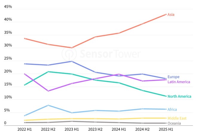 Asia became the fastest-growing market for GenAI apps, holding the top position with a 42.6% share of download volume, where India and mainland China contributed significantly. In the first half of 2025, the download volume growth rate in the Asian market reached as high as 80%, far exceeding that of Europe (51%) and North America (39%). Although Latin America saw the fastest in-app purchase growth for GenAI apps, North America still maintained the leading position with a 40% share.