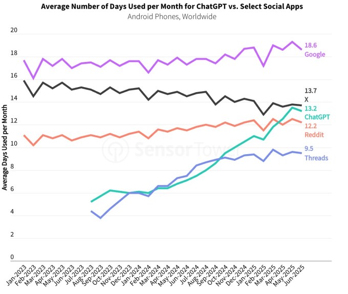 User reliance on various AI assistants continues to increase, with ChatGPT showing particularly strong user retention. According to the report, in the first half of 2025, users used ChatGPT for an average of over 12 days per month, with usage frequency comparable to popular social platforms such as X and Reddit, second only to Google. Notably, the weekend usage rate of ChatGPT has also increased, indicating that users are increasingly relying on this AI chat application outside of work hours.